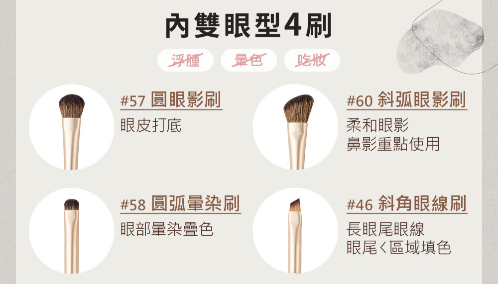 #3 圓弧暈染掃58:極短但柔軟的掃型,掃頭保有微微尖端及刷毛層次,集中顯色的同時,保有邊界自然柔和的優點。適合內雙、單眼皮暈染功能。